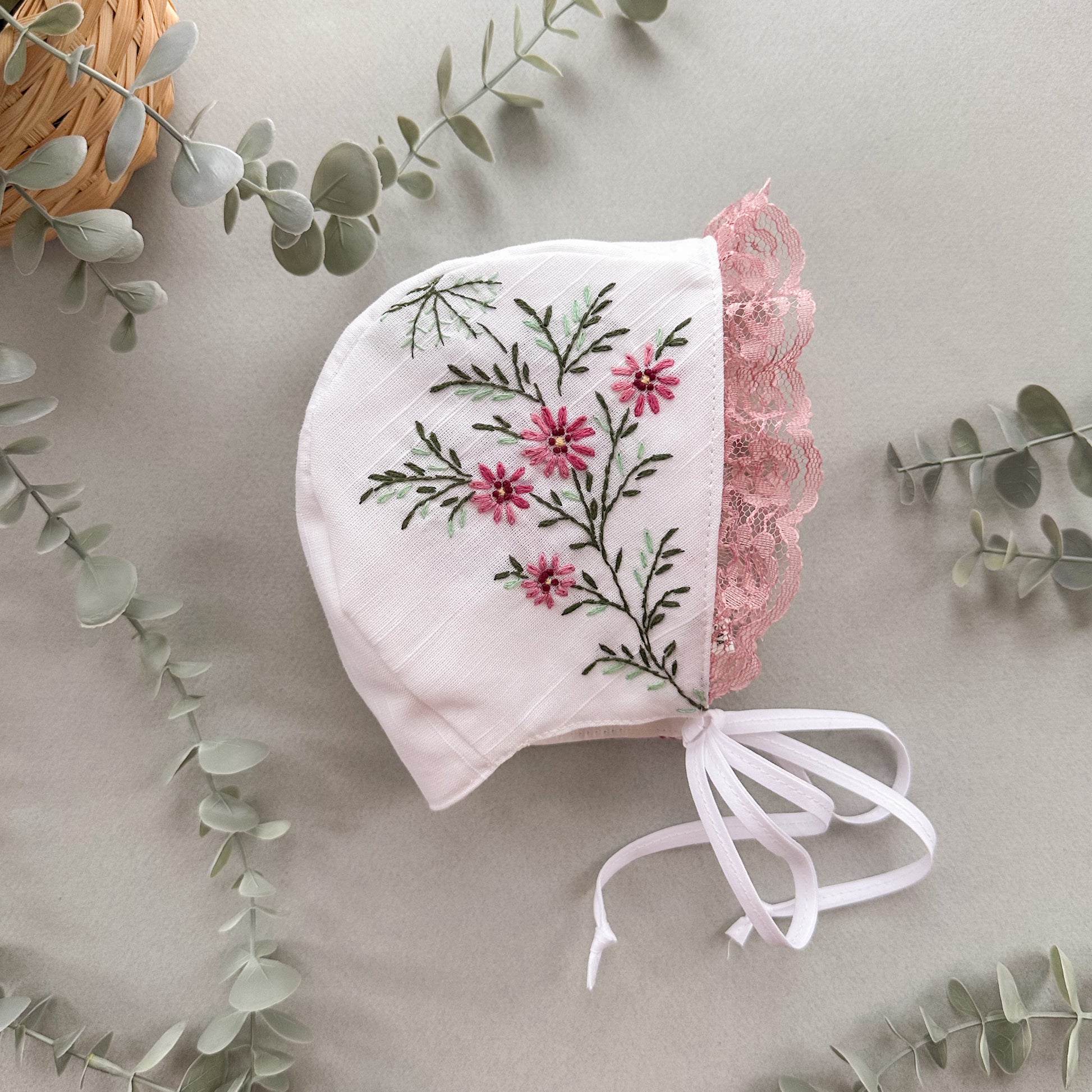 This bonnet must be hand-washed and air-dried. Cool iron, if needed.