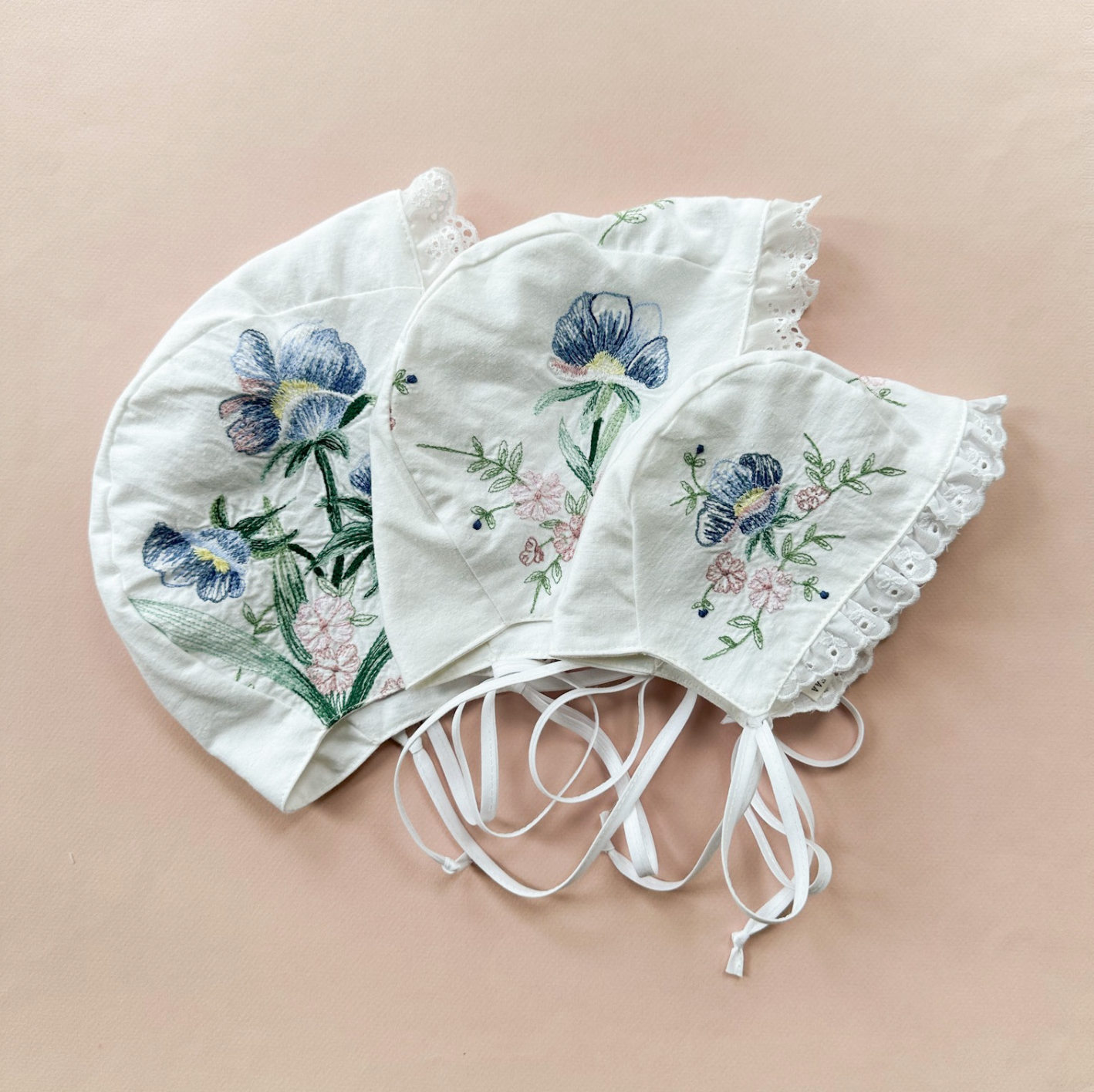 Please note that these are upcycled bonnets. I take gently used materials and transform them into heirloom-quality pieces. Slight imperfections may appear in the textiles, embroidery, or details, but each bonnet is carefully constructed with over 25 years of sewing experience. I see these little imperfections as “perfectly imperfect”, a reminder that a textile once destined for a landfill now gets to be loved and worn again.