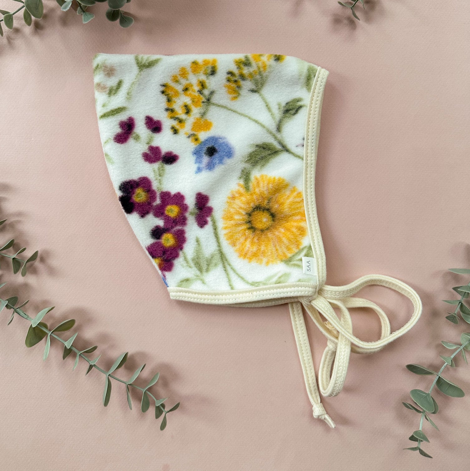 This bonnet must be hand-washed and hung to dry. Cool iron, if needed.