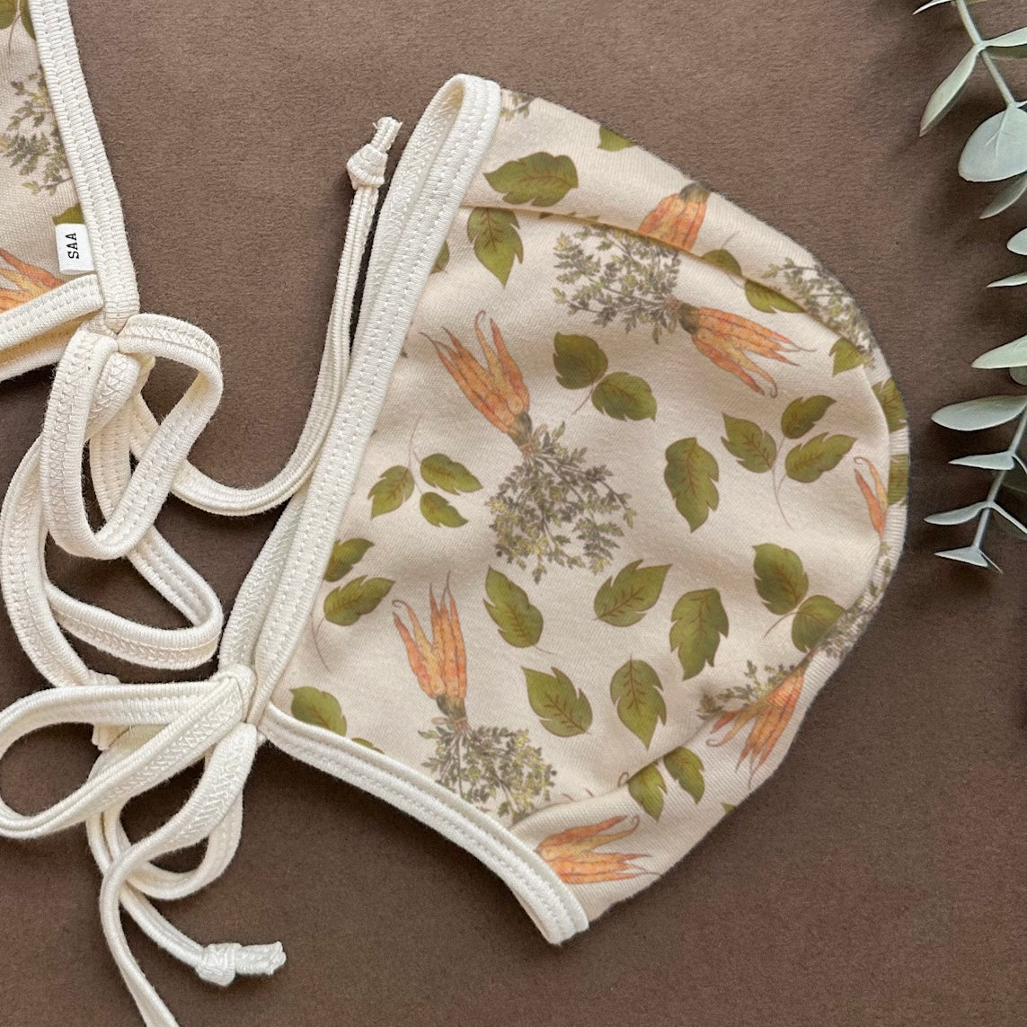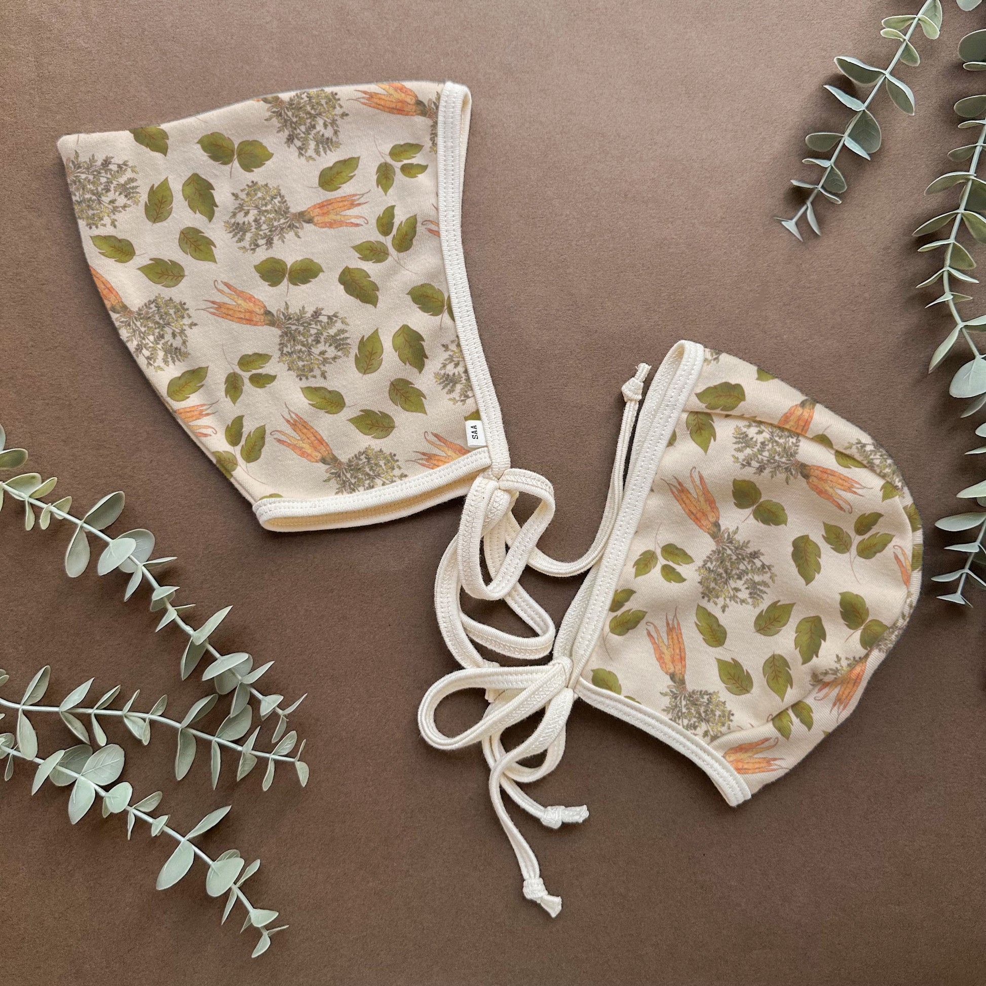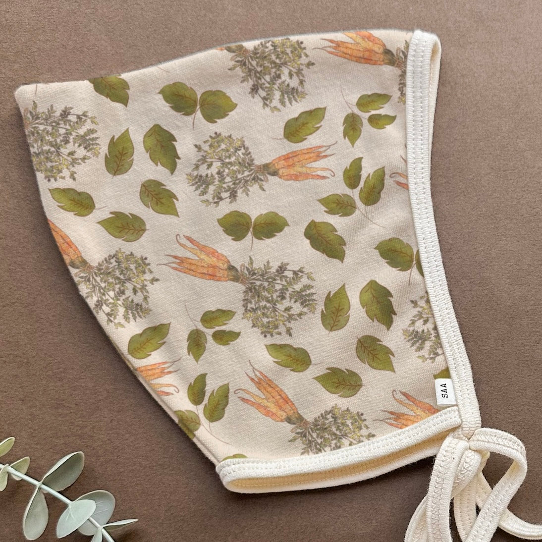 Carrie, after painting for over 10 years, has fallen in love with pattern design. This exclusive design was eco -printed on 100% cotton to make this bonnet.