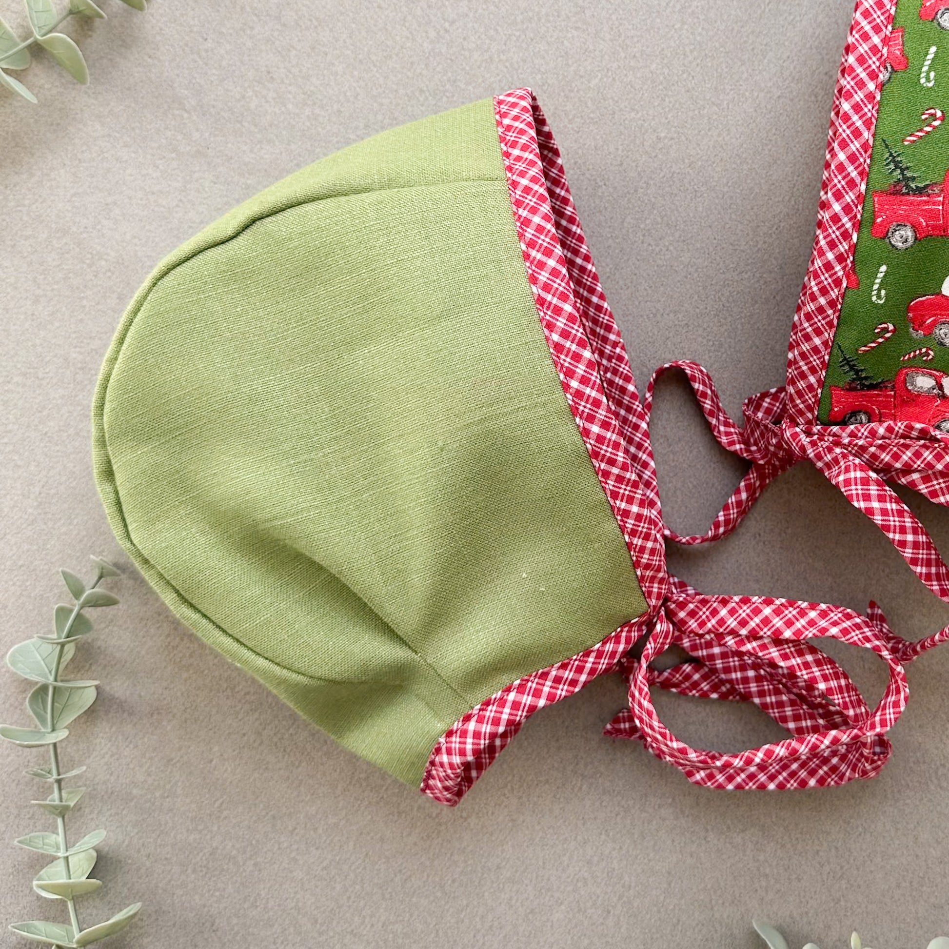 Please keep in mind that the bonnet pictured may not be the exact bonnet you receive. The print, embroidery pattern, and/or lace may differ depending on which part of the textile the bonnet was cut from. Also, colors can change on different screens. I photograph the bonnets in natural light to keep the colors as accurate as possible.