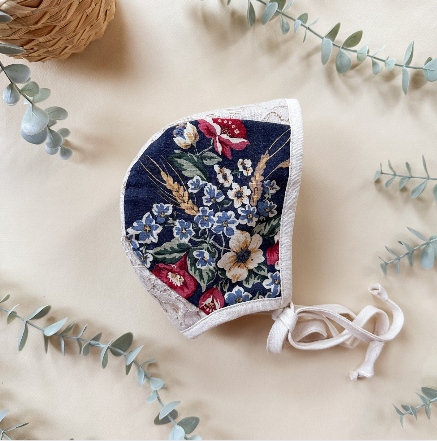 • Fabric Content: 100% cotton bonnet with cotton/poly lace, linen trim, and a surprise cotton lining to make it reversible