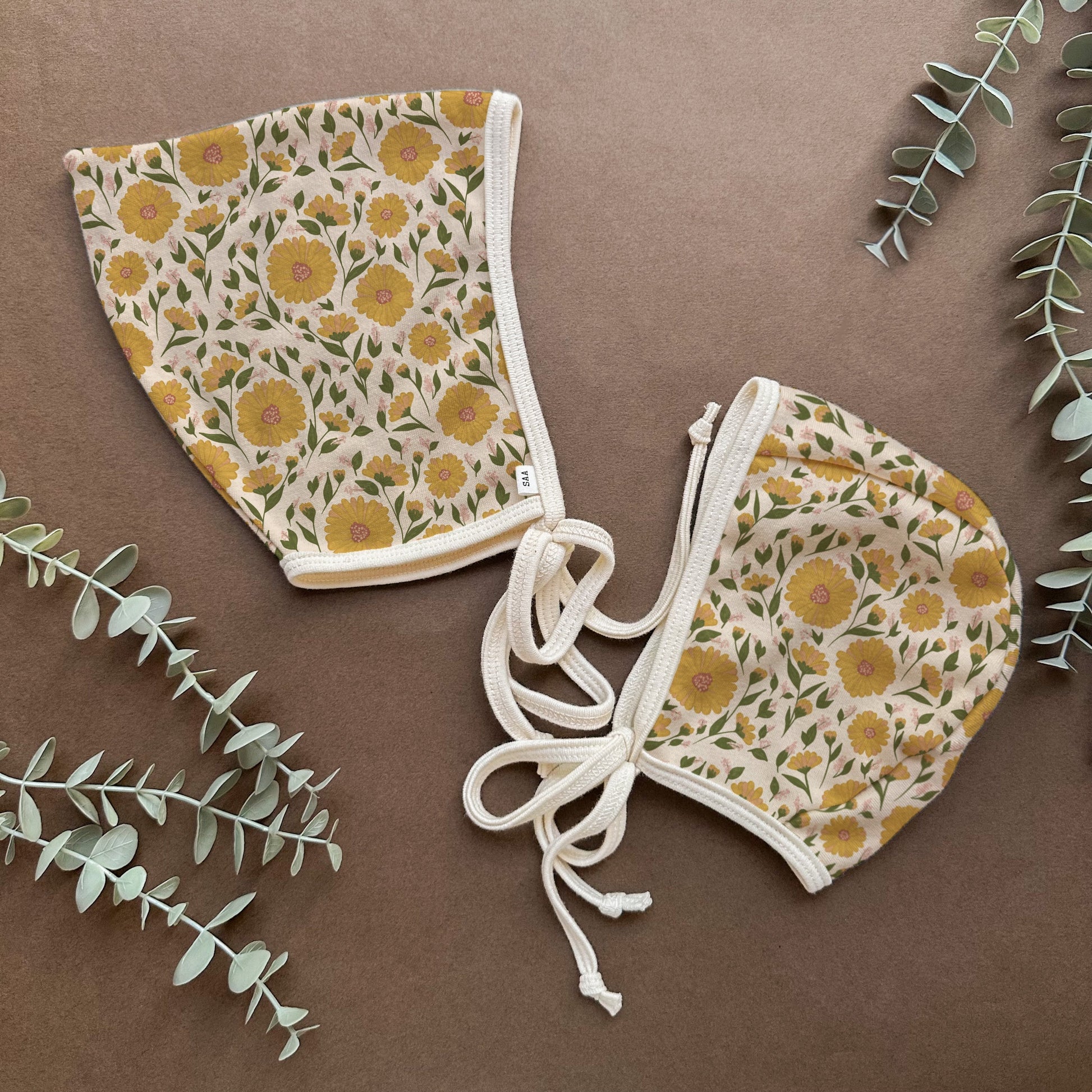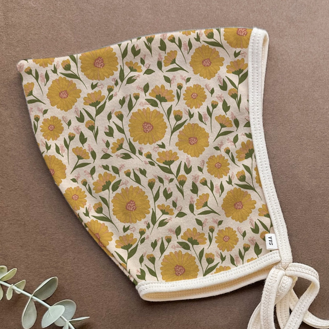 Carrie, after painting for over 10 years, has fallen in love with pattern design. This exclusive design was eco -printed on 100% cotton to make this bonnet.