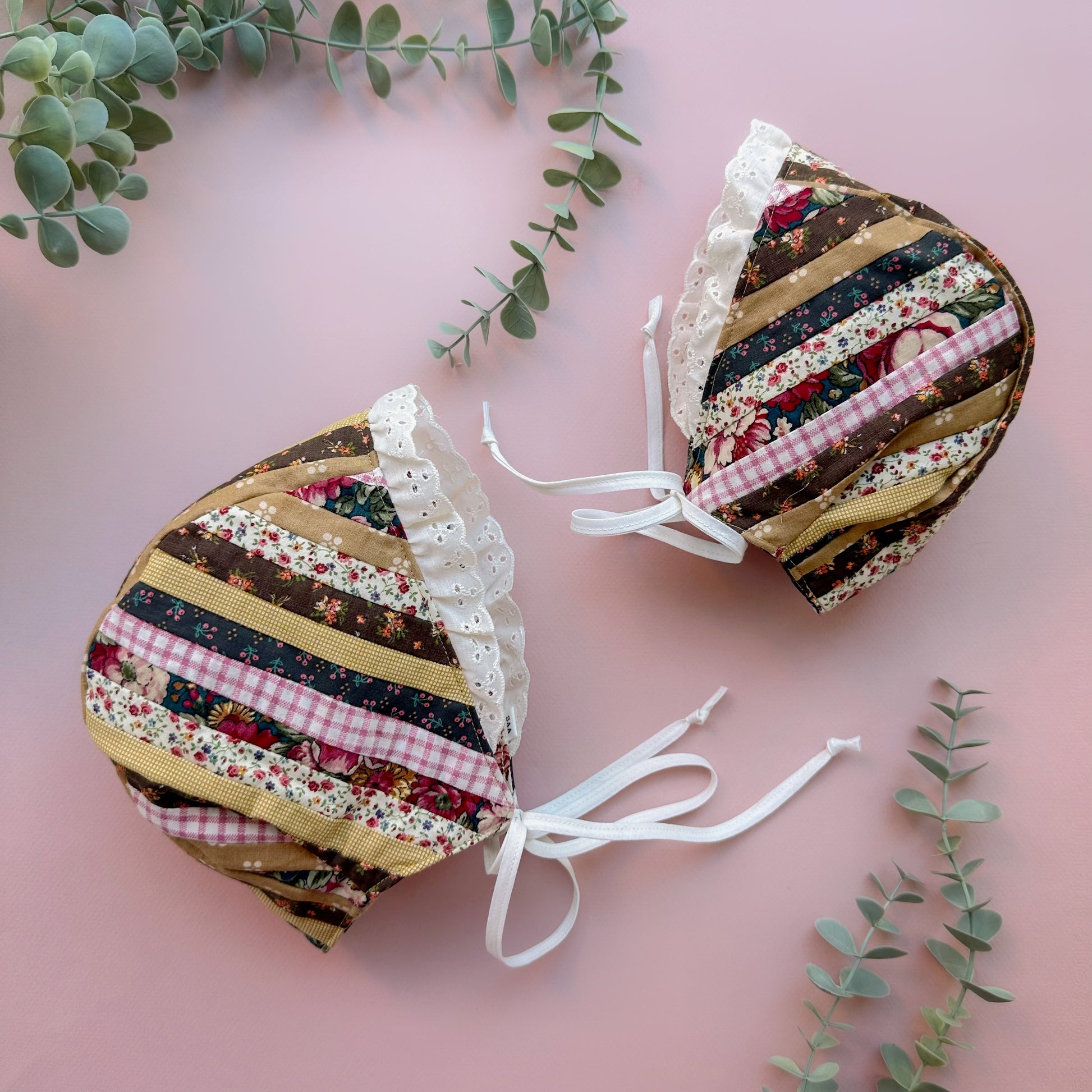 This is a one-of-a-kind bonnet (OOAK) meaning that the combination of textiles LIKELY will not happen again. It also has a surprise linings & is reversible! Because a lot of our bonnets are made from upcycled materials this means that we do not always come across the materials again. And if we do the designs are always a little different. We hope that you enjoy these heirloom quality bonnets - it's hard for us not to keep every single one of them!