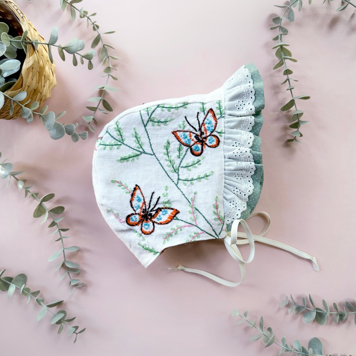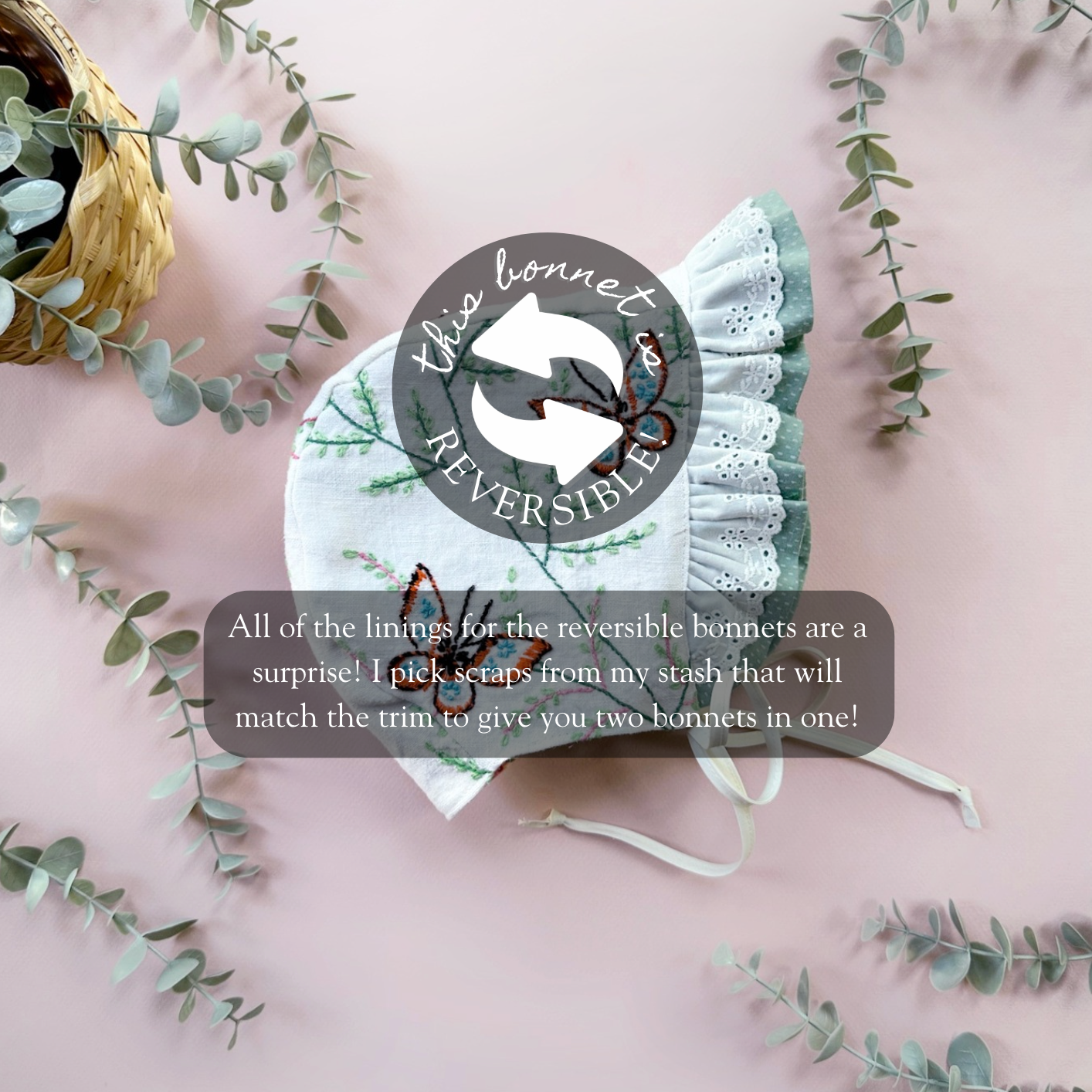 Please note that these are upcycled bonnets. I take gently used materials and transform them into heirloom-quality pieces. Slight imperfections may appear in the textiles, embroidery, or details, but each bonnet is carefully constructed with over 25 years of sewing experience. I see these little imperfections as “perfectly imperfect”, a reminder that a textile once destined for a landfill now gets to be loved and worn again.