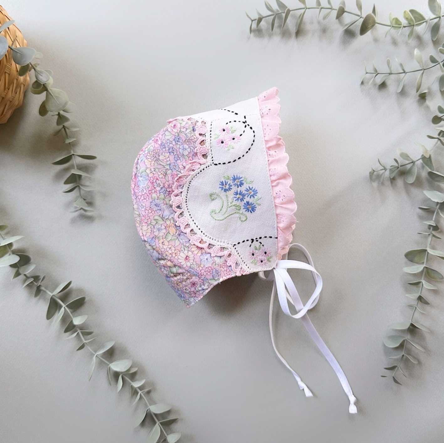Please note that these are upcycled bonnets. I take gently used materials and transform them into heirloom-quality pieces. Slight imperfections may appear in the textiles, embroidery, or details, but each bonnet is carefully constructed with over 25 years of sewing experience. I see these little imperfections as “perfectly imperfect”, a reminder that a textile once destined for a landfill now gets to be loved and worn again.
