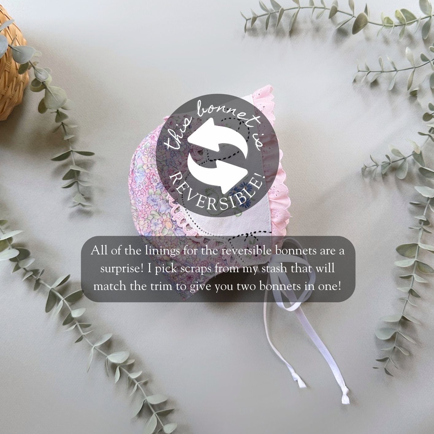 Please keep in mind that the bonnet pictured may not be the exact bonnet you receive. The print, embroidery pattern, and/or lace may differ, depending on which part of the textile the bonnet was cut from. Additionally, colors can vary on different screens, so I try to photograph the bonnets in natural light to preserve the colors as accurately as possible.