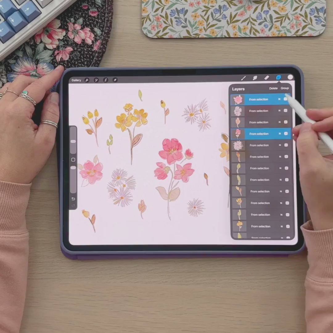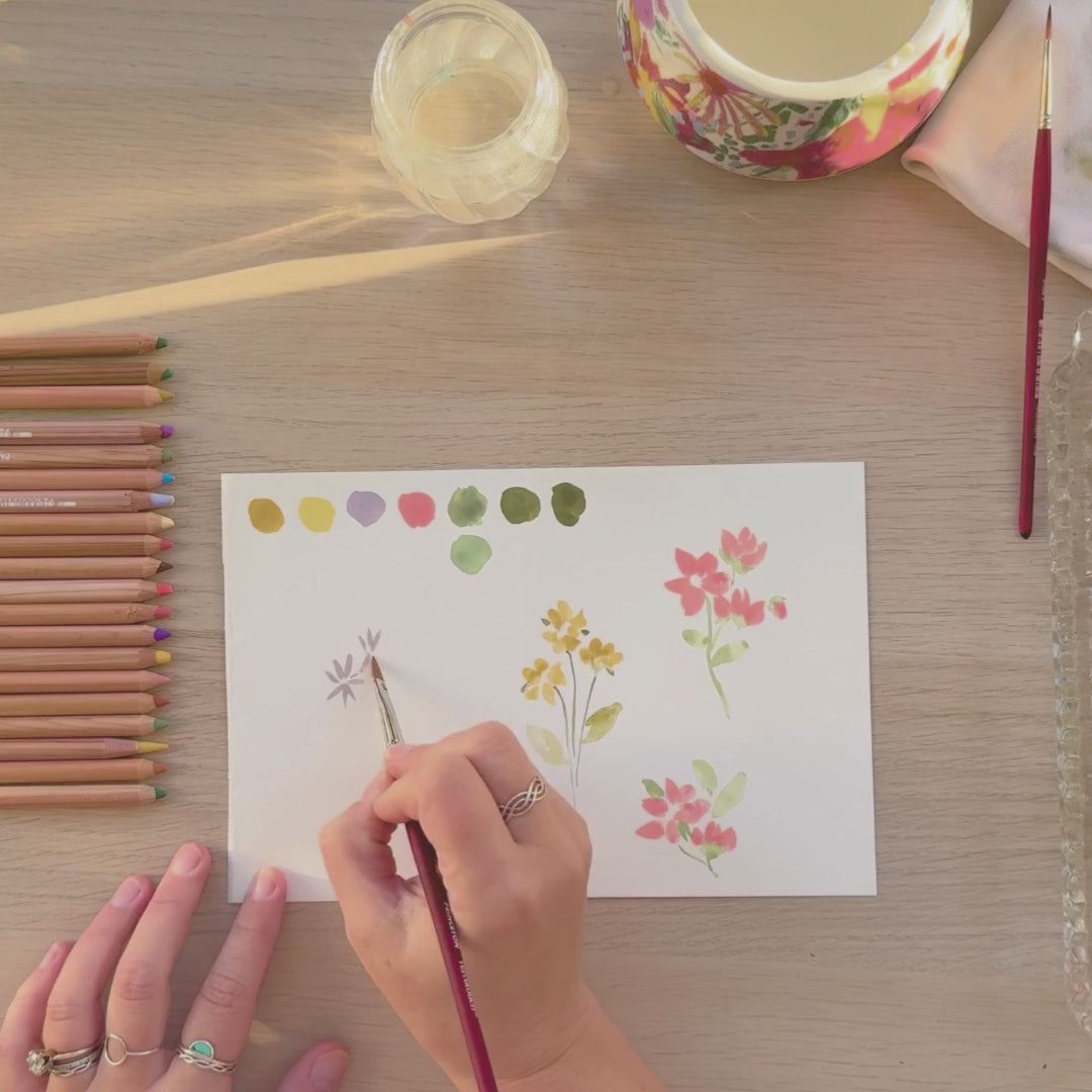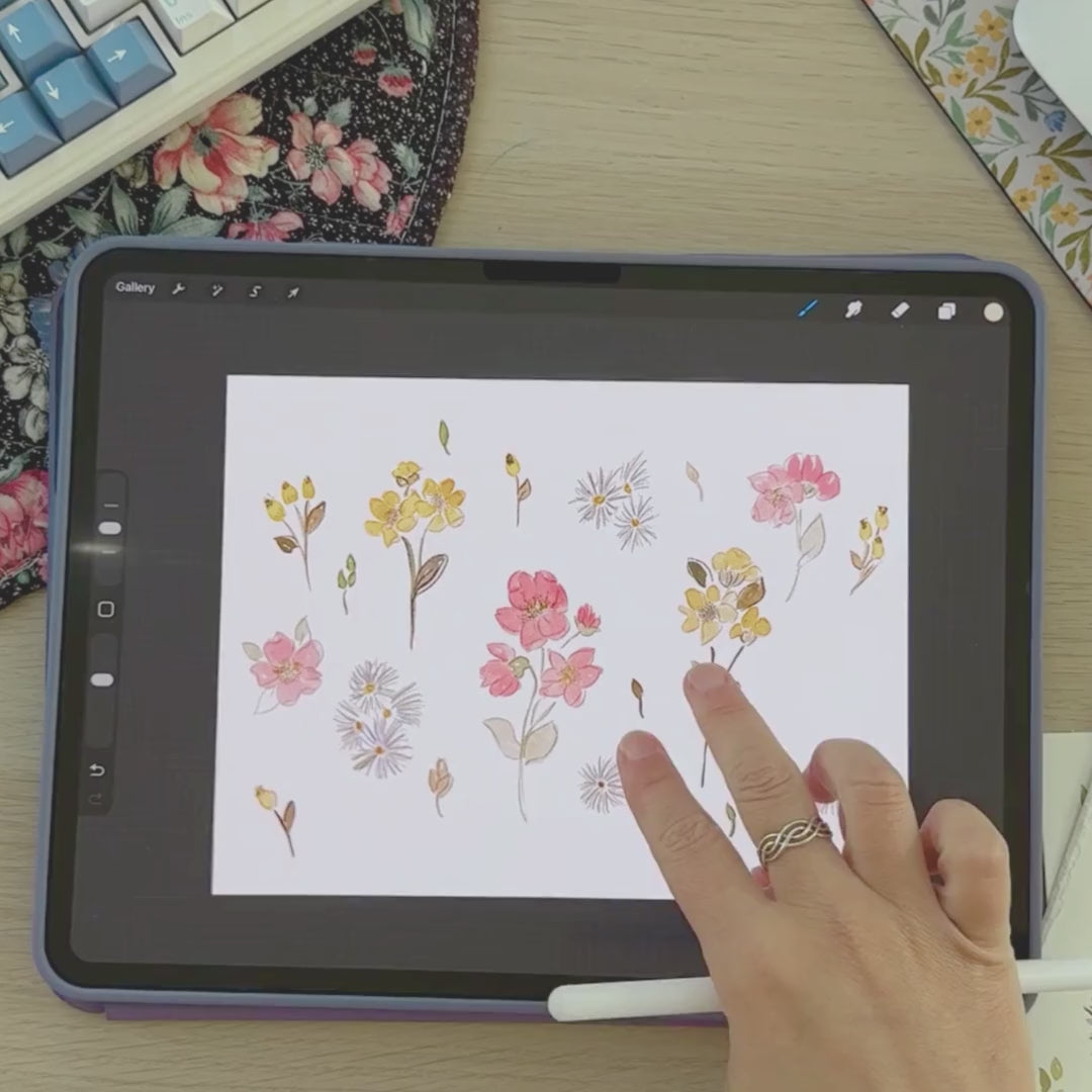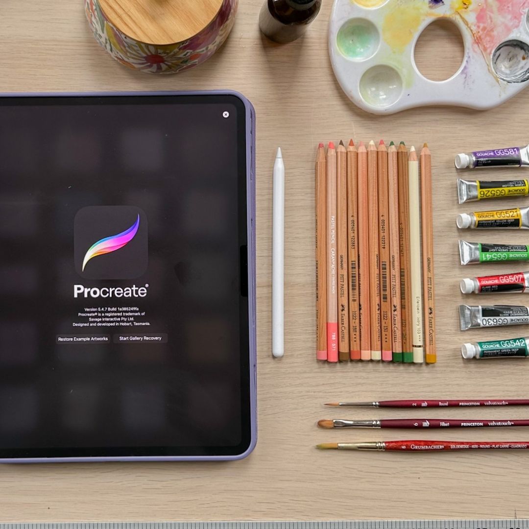 To participate, you’ll need an iPad with an Apple Pencil and Procreate installed, along with whatever traditional medium you love to paint with. The course is fully pre-recorded, so you can watch and rewatch each lesson at your own pace. Every lesson is supported by a thoughtfully designed workbook with space for notes, helpful prompts, and reference pages. You’ll also receive a custom Procreate brush pack to use alongside me during the digital portions of the course, plus a canvas file so you can jump right in without setup stress.