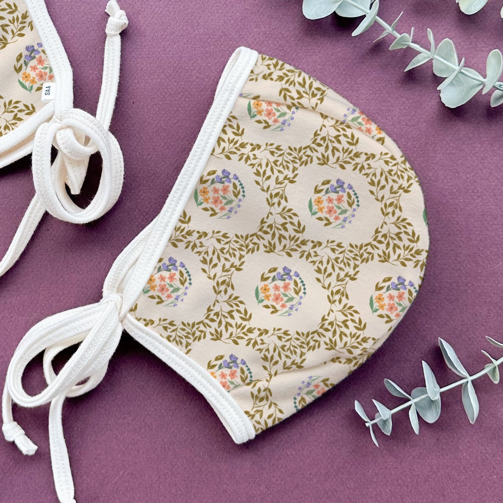 Carrie, after painting for over 10 years, has fallen in love with pattern design. This exclusive design was eco -printed on 100% cotton to make this bonnet.