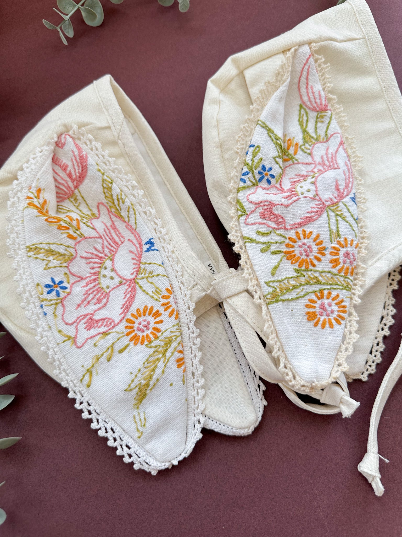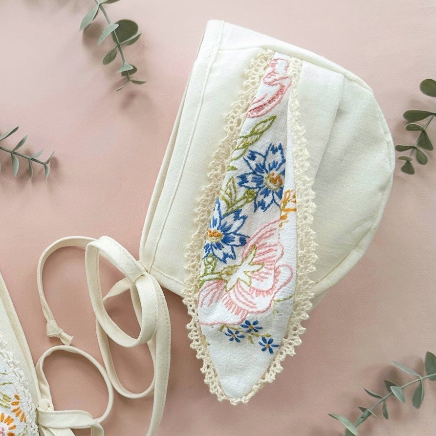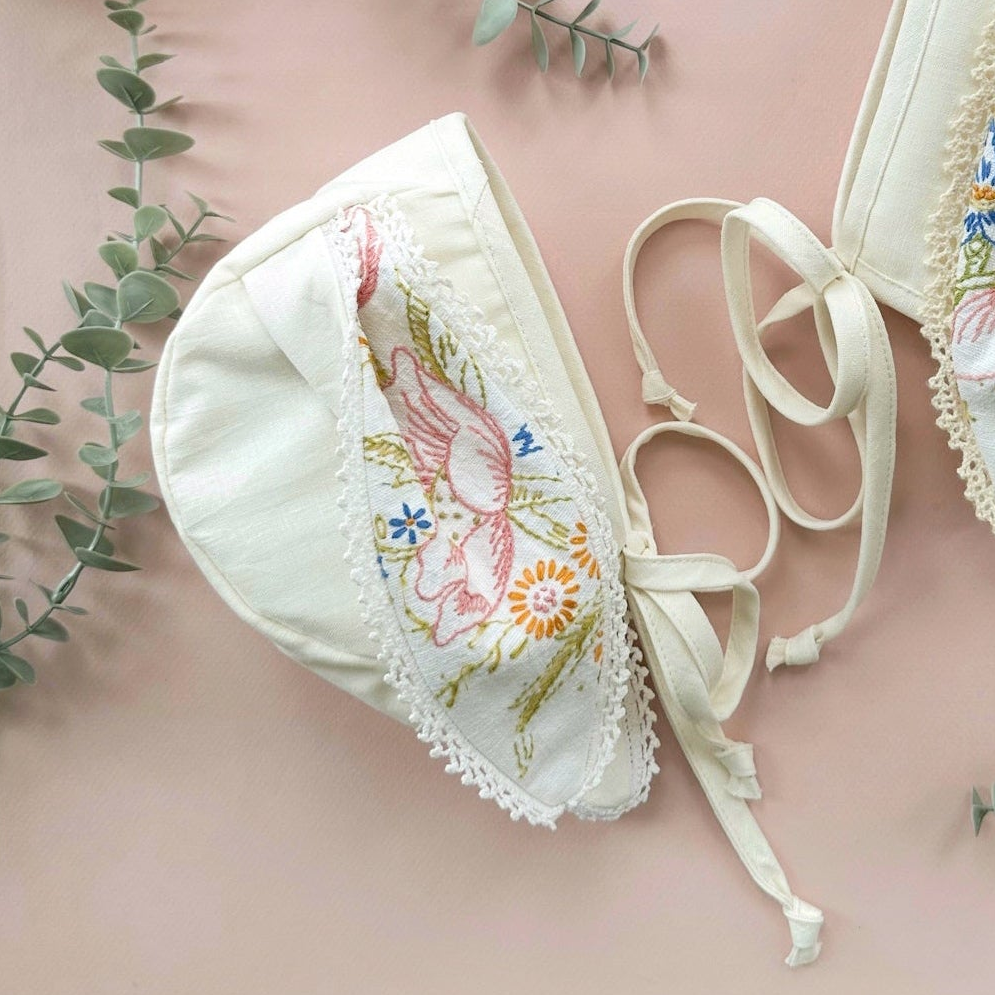 • Fabric Content: These bonnets were made from a well-loved vintage embroidered table runner combined with new cotton and linen materials. The trim on the ears was the crochet edging on a runner.